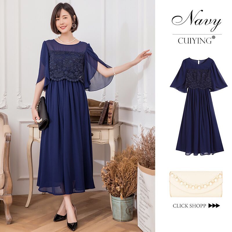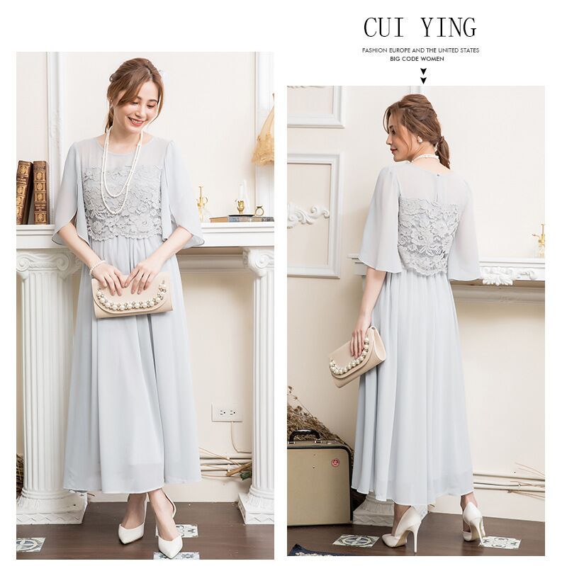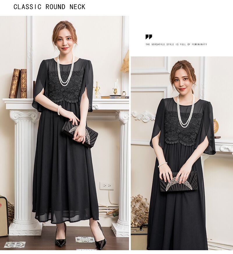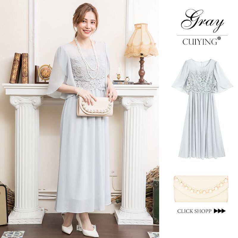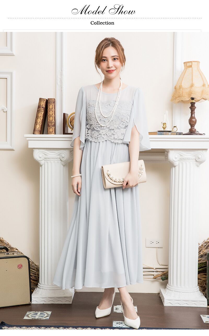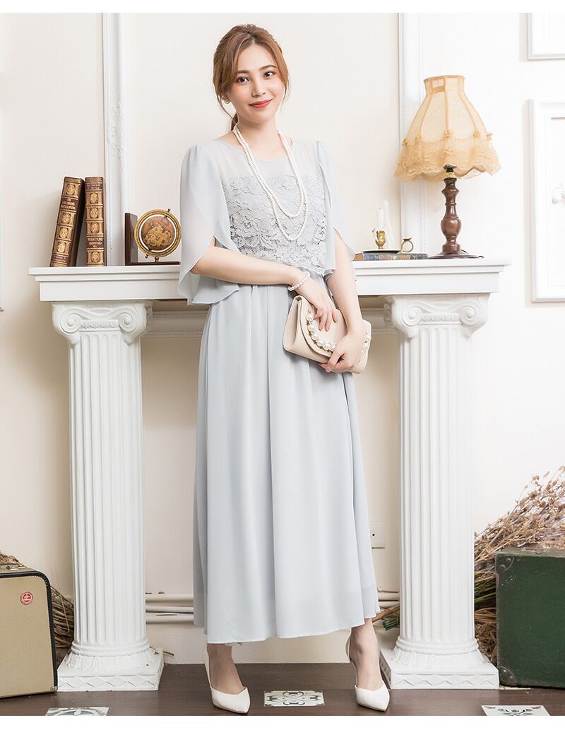 上品なレーストップスとエアリーなシフォンスカートを組み合わせたエレガントなロングワンピース。