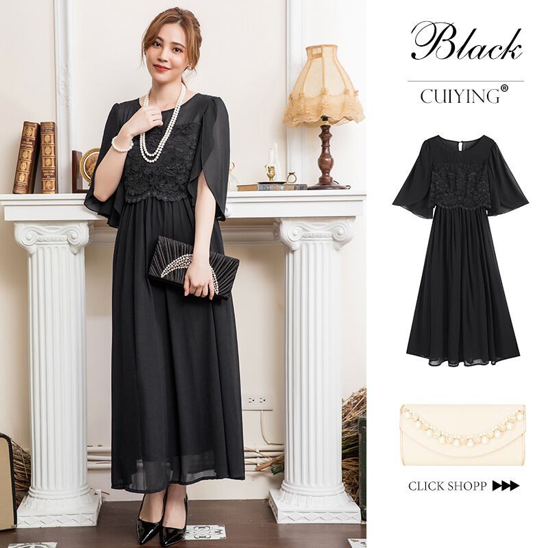 春夏新作 レース切替 フリルスリーブ ハイウエスト エレガント ロング丈 ドレスワンピース 上品 きれいめ レディース [CosVibe-1]